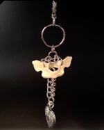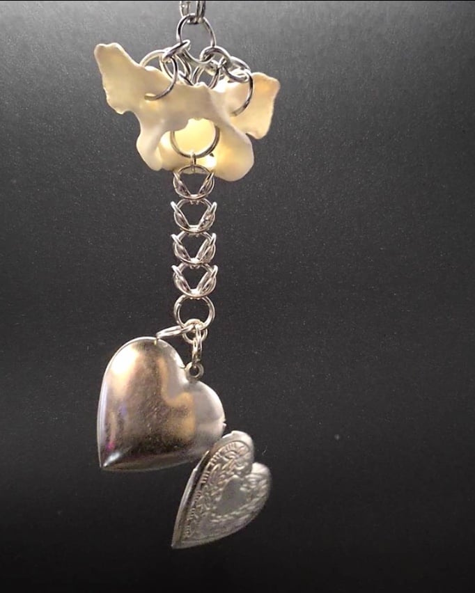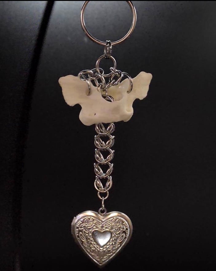 This love forever keychain features a raccoon atlas vertebrae and a silver heart locket hanging by a woven chain.